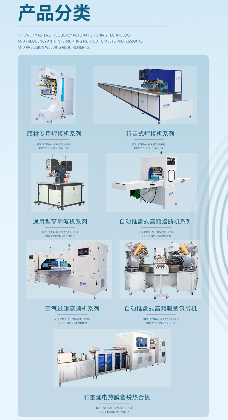 ★高周波熔接機(jī),通常也稱為高周波吸塑包裝機(jī)、高周波塑料熔接機(jī)、高頻熱合機(jī)、高頻封口機(jī)、吸塑包裝機(jī)、高周波封口包裝機(jī)、熱合封口包裝、泡殼包裝機(jī)、高頻熱合包裝機(jī)、吸塑包裝機(jī)、高周波封口機(jī)、高頻包裝機(jī)、高周波包裝機(jī)、包裝機(jī)械等等。單頭推盤式高周波熔接機(jī)和單頭轉(zhuǎn)盤式高周波熔接機(jī)有手動和自動兩種可供選擇,自動推盤式或自動轉(zhuǎn)盤式的高周波機(jī)效率更高,產(chǎn)量更好。自動滑臺式高周波熔接機(jī)為雙向自動滑臺,往返式連續(xù)送料熔接,定位準(zhǔn)。也適用用大面積產(chǎn)品的加工,熔接,如PVC水床,漂流筏,兒童泳池等。