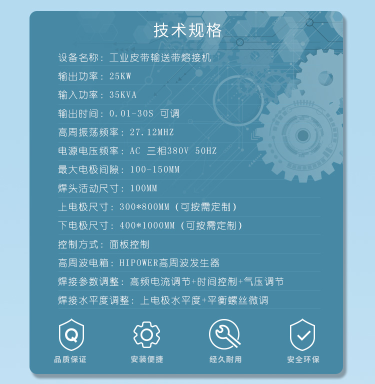 適用范圍: | 專用于跑步帶,輸送帶、皮帶檔板、工業(yè)皮帶裙邊的高周波焊接熔接 |