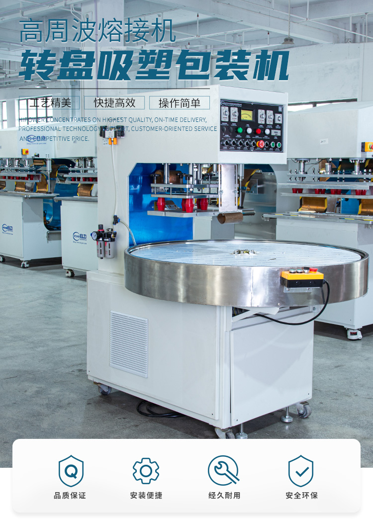 ★高周波熔接機,通常也稱為高周波吸塑包裝機、高周波塑料熔接機、高頻熱合機、高頻封口機、吸塑包裝機、高周波封口包裝機、熱合封口包裝、泡殼包裝機、高頻熱合包裝機、吸塑包裝機、高周波封口機、高頻包裝機、高周波包裝機、包裝機械等等。單頭轉盤式高周波熔接機有手動和自動兩種可供選擇,自動轉盤式高周波熔接機采用精密分割器裝置,采用臺灣馬達驅動。工位輪流作業(yè),定位準,可選配機械手自動取料。 ★用于吸塑包裝封口的高周波機器,使用時可根據吸塑包裝的產品尺寸大小,來決定一次同時包裝一個或多個產品。工作臺自動旋轉,3-6工位可選擇,工作效率更高。更多詳細情況歡迎致電日力公司。