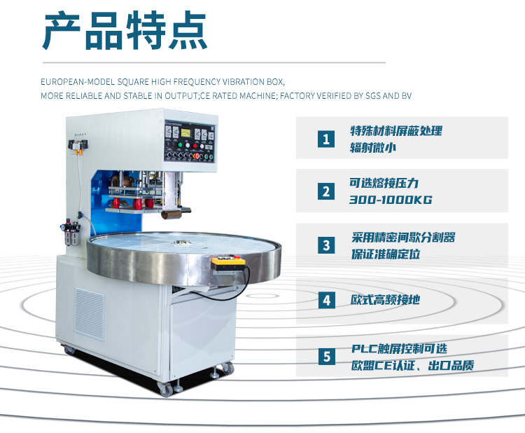 機器特點: | 自動轉盤式高周波熔斷機采用精密分割器裝置,采用臺灣馬達驅動。三工位輪流作業(yè),工位定位精準??蛇x用機械手自動取料節(jié)約人工 |