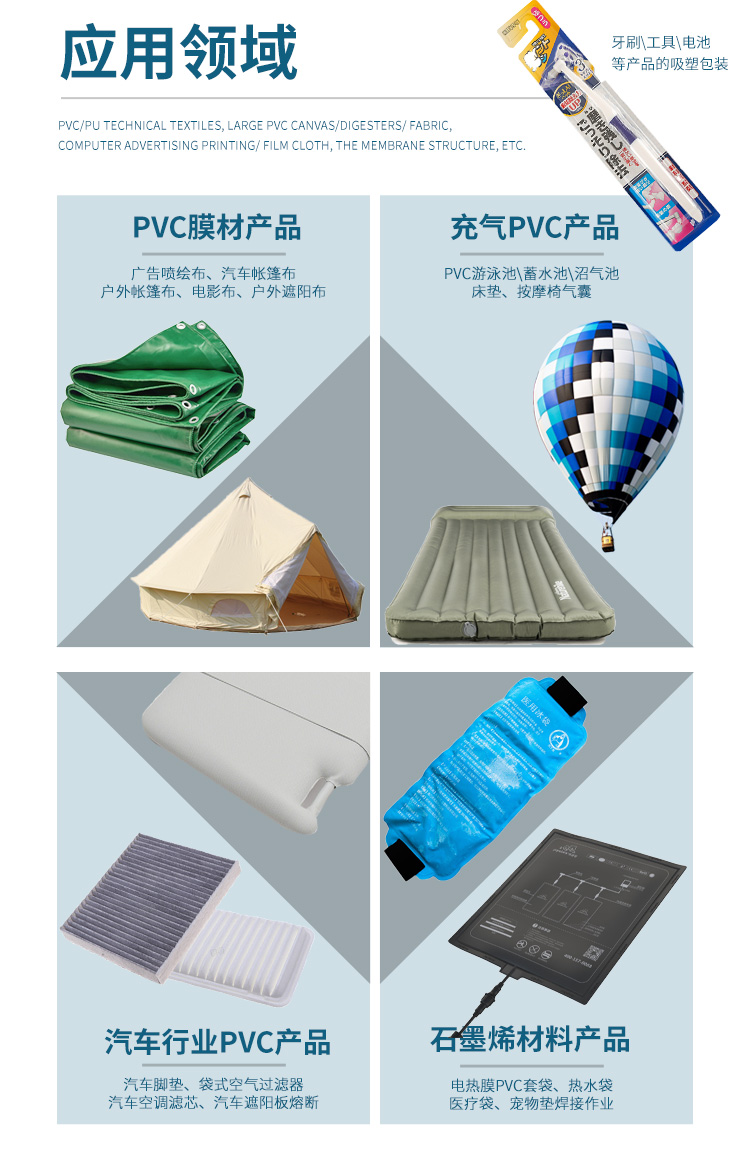 文具用品包裝、電子產品包裝、MP3、MP4、MP5吸塑包裝、牙刷包裝、牙線包裝、玩具包裝、禮品包裝、五金工具包裝、U盤包裝等吸塑紙卡包裝,也可用于PVC柔軟線膠盒成型,塑料熔接、PVC加工等用途。