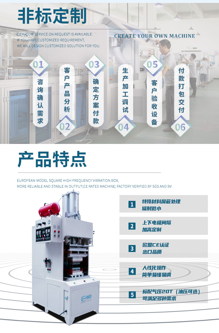 用途: 主要用于需要高周波熔接同時又必須同步裁斷的產(chǎn)品加工,高周波機(jī)的工作原理是利用高周波先熔接再通機(jī)器配有的壓力裝置同