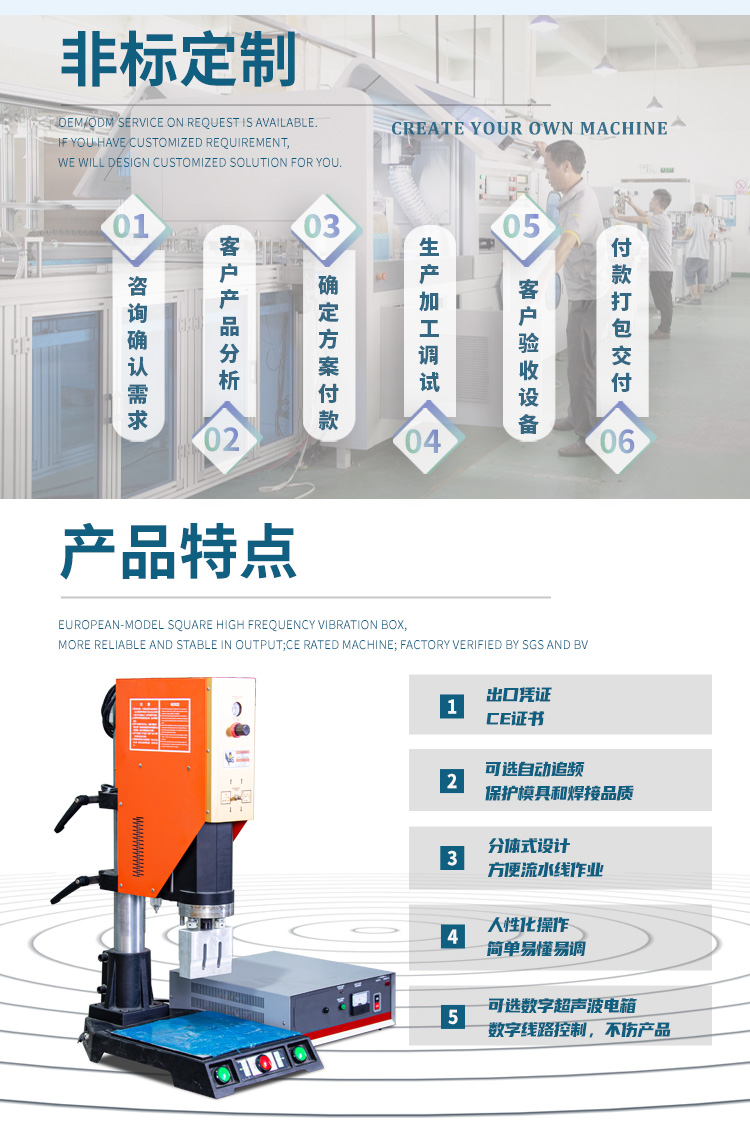 5. 超聲波發(fā)生器電箱: 美式數(shù)字線路,微電腦屏幕,人性化操作,簡單易懂易調(diào),精確的時間控制,可1ms遞增減,無時間差;