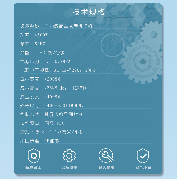 1、全自動(dòng)圓筒底蓋成型機(jī)模具采用壓板裝夾,方便調(diào)整和安裝。 三,全自動(dòng)圓筒底蓋成型機(jī)技術(shù)規(guī)格: