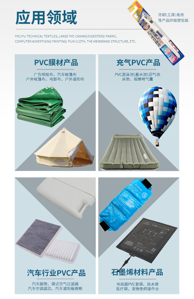 ※通過(guò)高周波的原理,用于大面積,大尺寸PVC或膜結(jié)構(gòu)焊接,如航天工程,充氣游樂(lè)設(shè)備,大型帳篷等,適用于PVC/PVDF涂層布的焊接