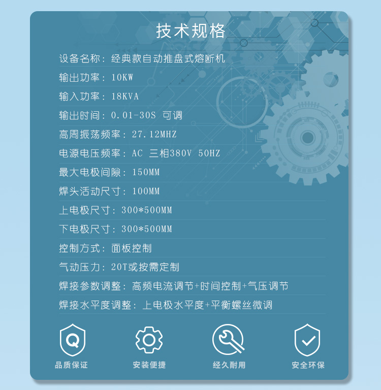 機器特點: | 熔斷機配有NL-5557高周波火花保護系統(tǒng),靈敏度極高,防止燒損高周波模具?;_式高周波熔斷機采用臺灣馬達驅(qū)動,工位定位精準。 |