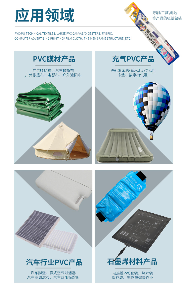 適用范圍: | 主要適用于APET、PETG、GAG環(huán)保材質的雙面吸塑泡殼的封口包裝、吸塑紙卡包裝、牙刷封口包裝,以EVA布類皮革、真皮、OPP、PU材質的熔接及熔斷。 |