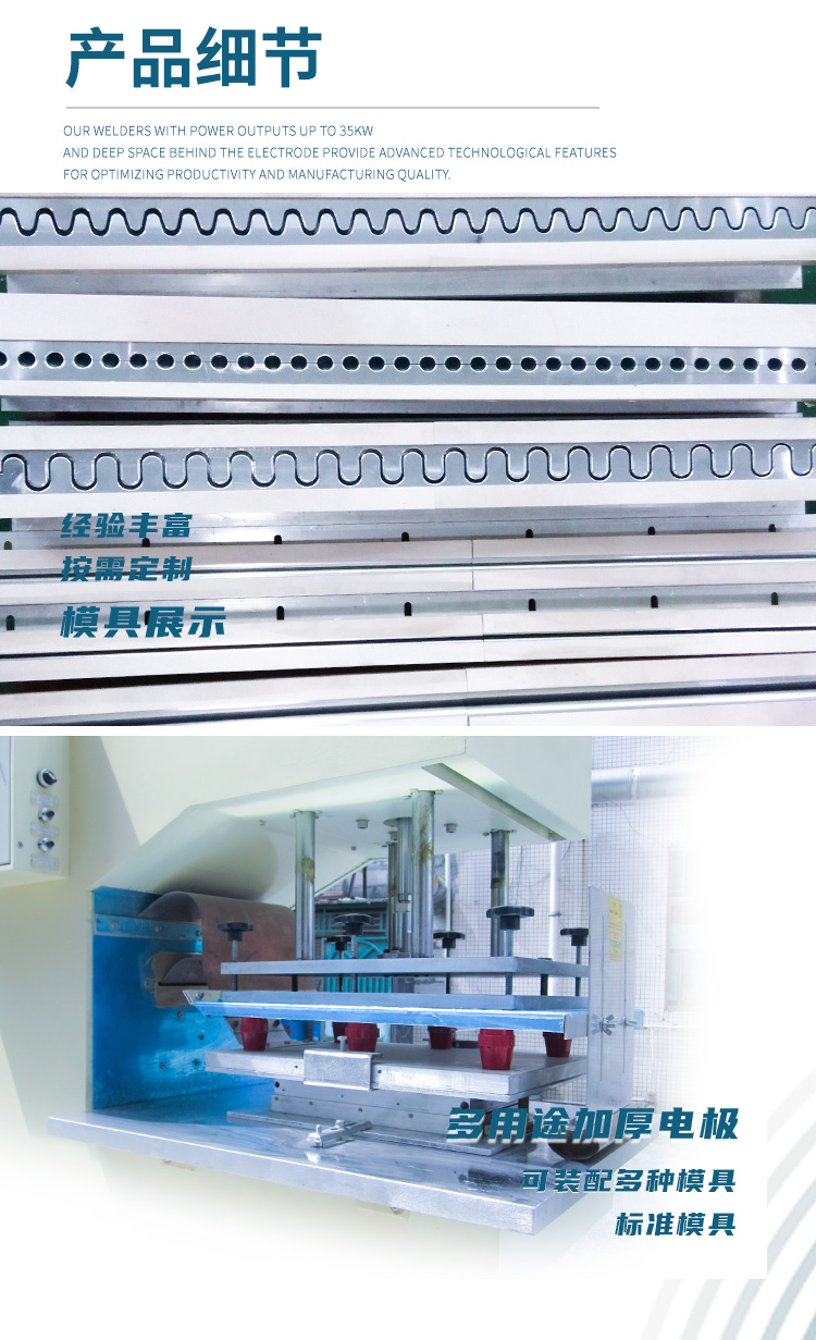 機(jī)器可連續(xù)壓線接熔,接熔長度可以自由定制。歐洲制式方形高頻震蕩箱,出力更大,更加穩(wěn)定。機(jī)器為C型結(jié)構(gòu),機(jī)身