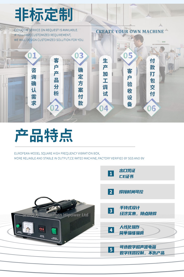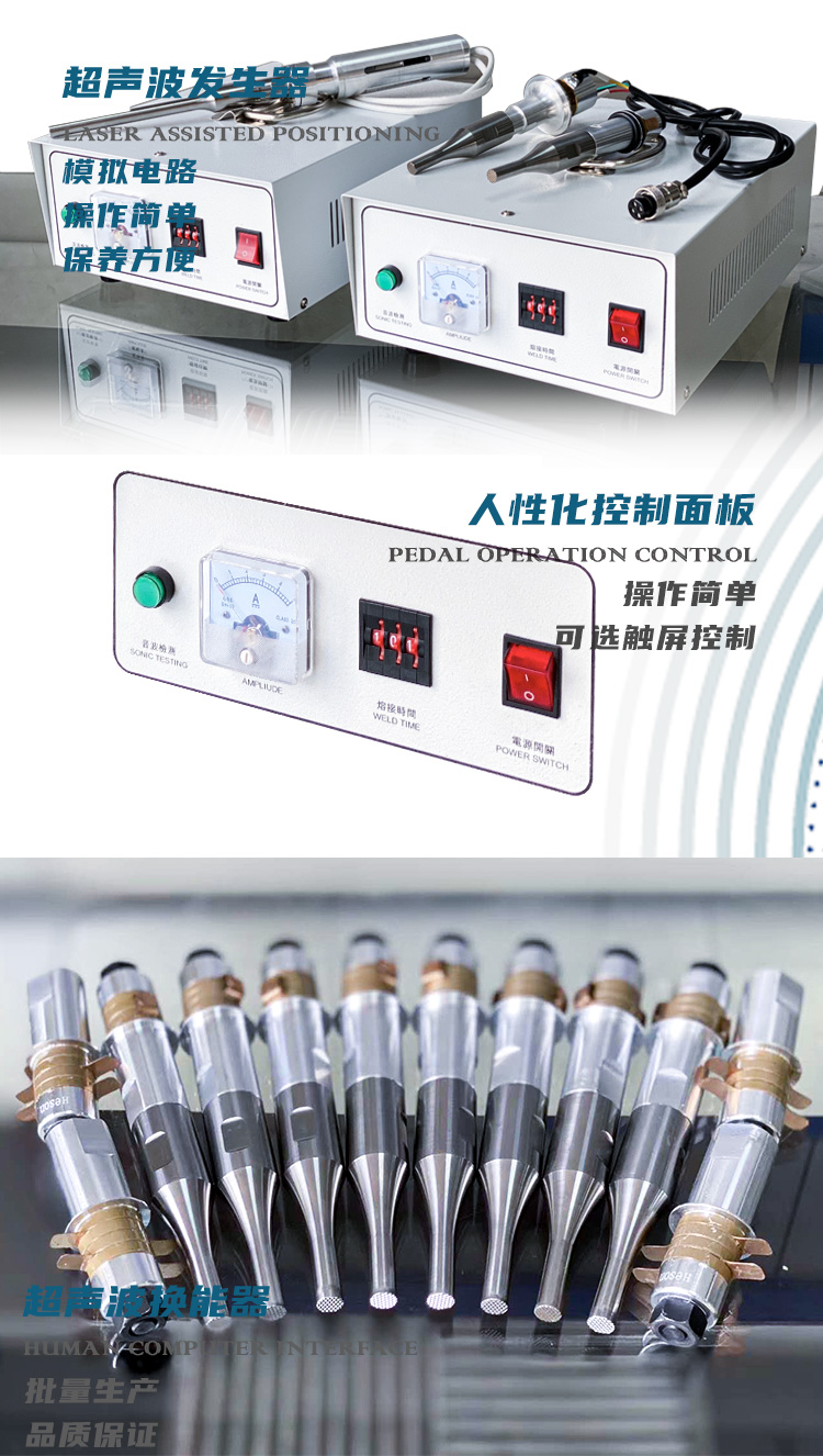 超聲波發(fā)生器(電箱): 采用美式數(shù)字線路,微電腦屏幕,人性化操作,簡(jiǎn)單易懂易調(diào),精確的時(shí)間控制,可以1ms遞增減,