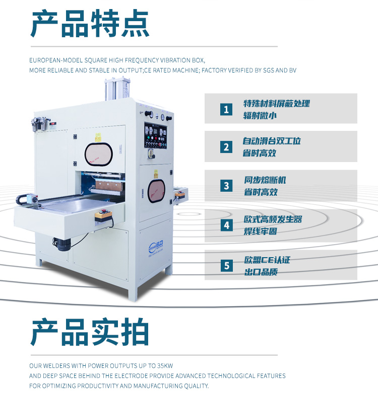 機(jī)器特點(diǎn): | 采用最新的 上下雙面高周設(shè)計(jì),以防打火,漏焊,虛焊自動(dòng)滑臺(tái)式高周波熔接機(jī)為雙向自動(dòng)滑臺(tái),往返式連續(xù)送料熔接,定位精準(zhǔn)。也適用用大面積產(chǎn)品的加工 |