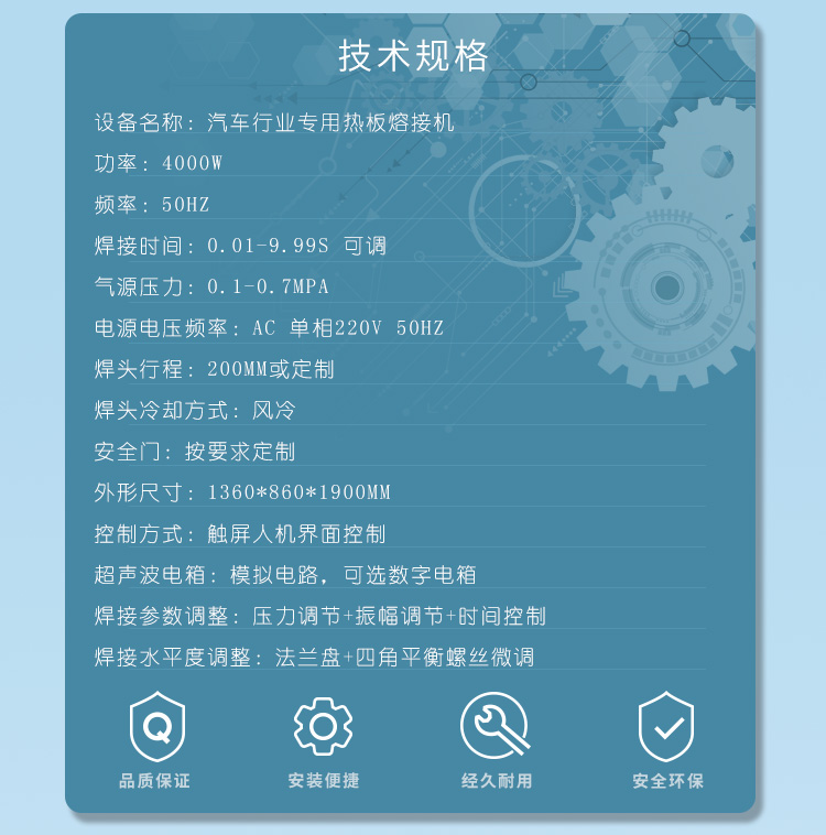 適用范圍: | 主要主要適合焊接產(chǎn)品面積大、不規(guī)范的塑料產(chǎn)品,如:汽車手套箱焊接,汽車保險(xiǎn)杠焊接,汽車儀表臺(tái)焊接,汽車水箱焊接,汽車尾燈熱板焊接,蓄電池?zé)岚搴附拥取? |