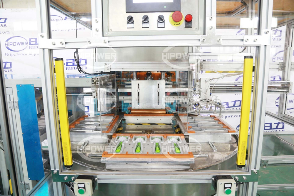 作業(yè)員按照轉(zhuǎn)盤節(jié)拍持續(xù)置入產(chǎn)品原料,高周波作業(yè)節(jié)拍高效率地自動化完成熔接作業(yè)。用戶可自由設(shè)置作業(yè)時間,一般為8-12秒一個作業(yè)節(jié)拍。