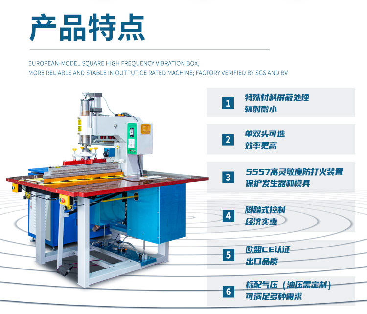★自動滑臺式高周波同步熔斷機振蕩頻率符合國際工業(yè)波段標(biāo)準(zhǔn),由高Q值真空電子管自激振蕩器產(chǎn)生高頻電磁場,使加工塑膠在上下電極間的高頻電場內(nèi),使其分子產(chǎn)生劇烈運動摩擦,在模具的壓力下得到其熔接效果。高周波熔斷機采用H型龍門結(jié)構(gòu),左右雙向自動滑臺,往返連續(xù)推送模具,運行高效。